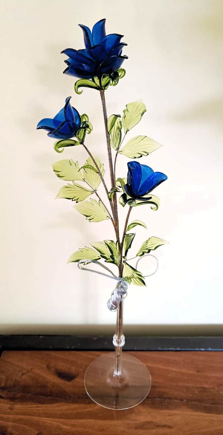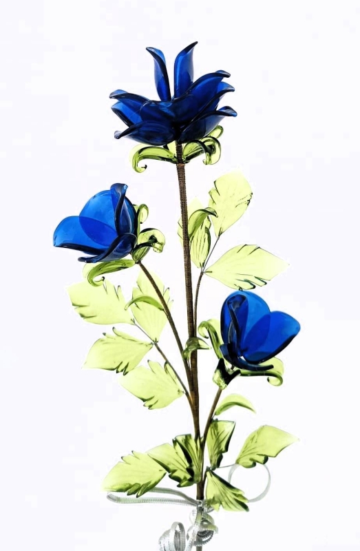 Kleur bloemknop -donker blauw glanzend Kleur blaadjes - groen transparant Inclusief het vaasje Hoogte - 35 cm Gewicht - 100 gram