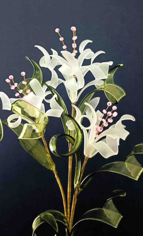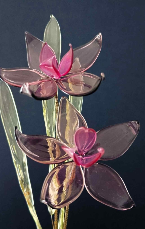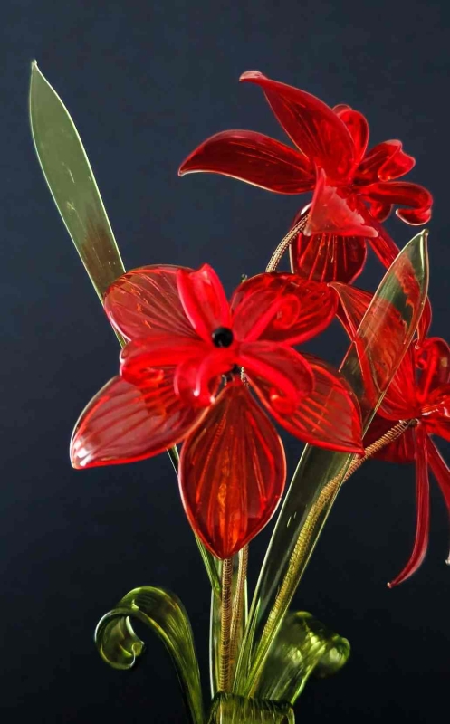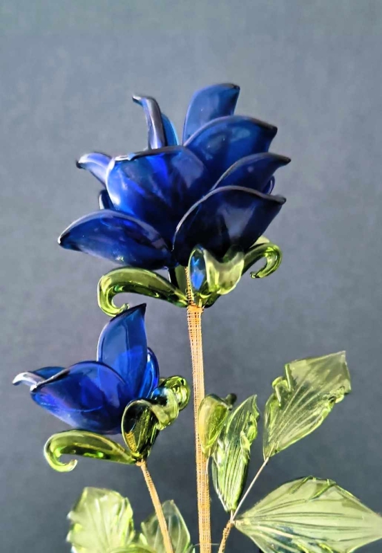 Elk blaadje wordt gemaakt met behulp van een gasbrander (lampwork), Het glas wordt gesmolten, aan ijzerdraad vastgemaakt en in het juiste model gevormd. Deze ijzerdraden worden daarna samengebonden waardoor glazen bloemknop ontstaat. Dan worden meerdere bloemknoppen en blaadjes aan elkaar gebonden en glazen bloemenboeket is klaar. Het is mogelijk om de ijzerdraden nog voorzichtig te buigen in de gewenste vorm.