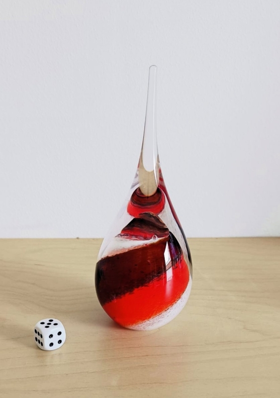 Traan van kristalglas met meerdere kleuren rood en wit. Deze druppel is meer dan een as-gedenkornament. Het is een mondgeblazen kunstwerk met een herinnering. Geen enkel druppel urn is hetzelfde, gezien het met handgemaakt is, is elk stuk uniek.