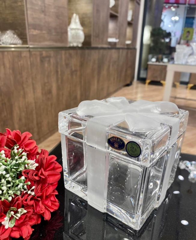 Kristallen vierkant schaaltje met deksel. Het strikje bovenop is mat wit. Bonbons erin en cadeau is klaar :-) Afmetingen - 11 x 11 x 11 cm Gewicht - 1,35 kg