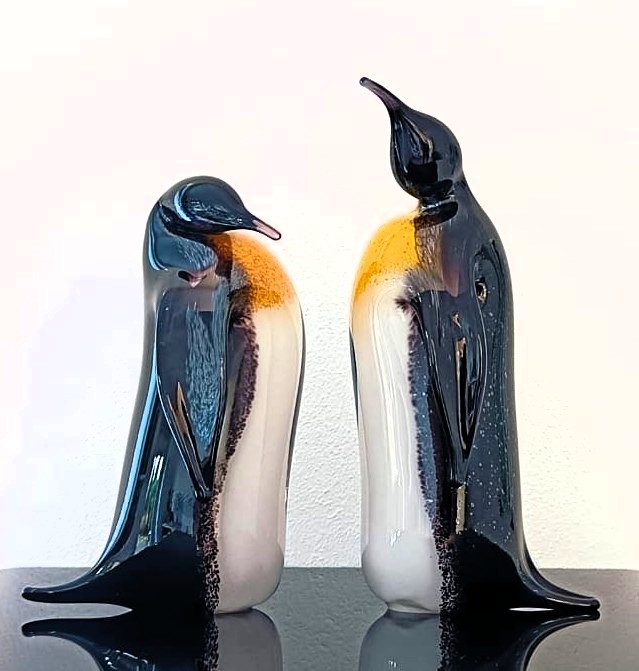 Prachtige handgemaakte glazen pinguïns, ca 19 cm hoog (de hoogste punt). Gewicht - samen meer dan 2 kilogram. Gezien handwerk kan de geleverde product iets afwijken van de foto.