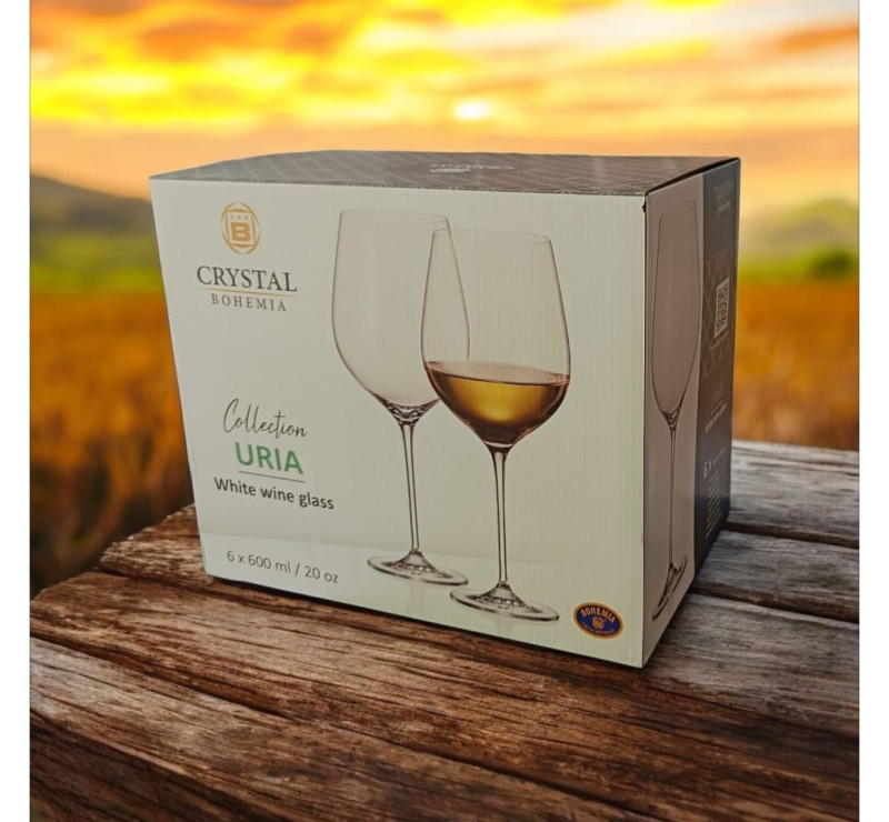 Deze URIA wijnglas is een van de klassiekers, nooit uit de mode. De kelk is groot. Op de doos staat vermeld dat het een 'white wine glass' is maar gezien de grote is het eigenlijk meer geschikt voor de rode wijn en voor aperol of andere cocktails. Gemaakt van sterk materiaal: kristalglas met titanium content. Verpakt per 6 stuks, in mooie bedrukte verpakking, leuk als cadeau. Prijs is per stuk, mogelijk natuurlijk ook los gekocht worden, in een algemene verpakking. Hoogte van het glas – 25 cm Inhoud – 600 ml